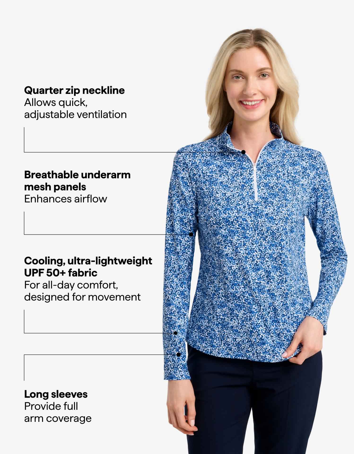 Underarm mesh panels enhance airflow, while the mock neck and full-length sleeves provide complete coverage. The quarter zip neckline allows easy ventilation on the go. From the golf course to the pickleball court or trail, this versatile top moves effortlessly with you, keeping you protected in style from sunrise to sunset.