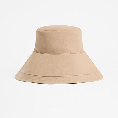 Woman wearing a beige bucket hat on a white background